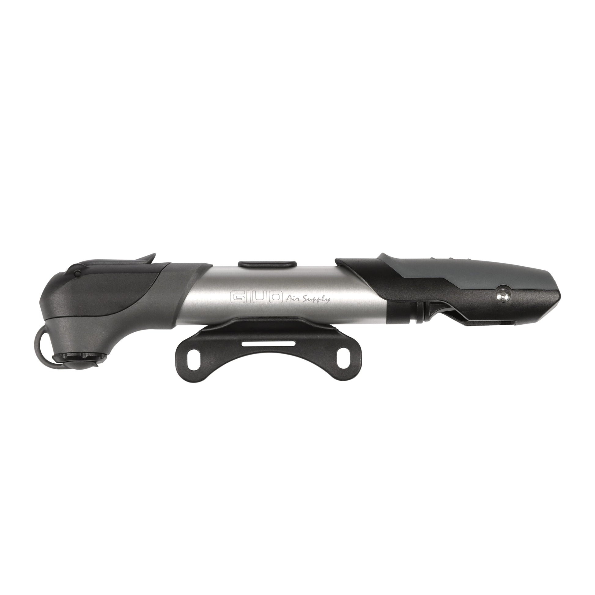 La bomba de bicicleta GIYO es fabricada en aluminio. Largo 23cm. Sin tecnología de mangueras. Presión máxima: 100 PSI (6,8 atmósferas). Tipo de tetina: SCHRADER (tetina automática), PRESTA (tetina Presta). El conjunto incluye un soporte para sujetarlo a una bicicleta en un lugar habitual. Asa plegable.