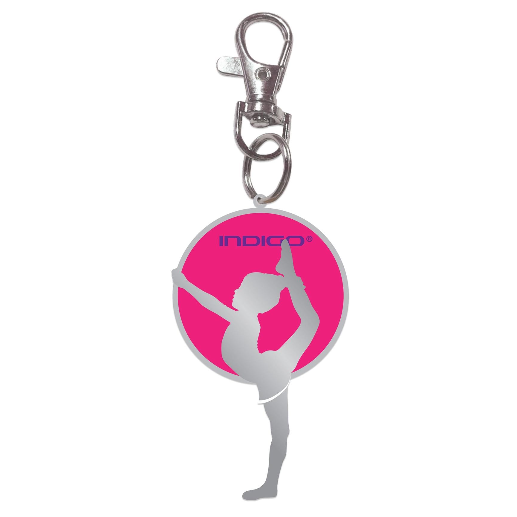 Llavero niña con aro INDIGO, con una decoración original. El tamaño óptimo para decorar una mochila, bolso de mano o llaves de gimnasta, también apto como souvenir para todos los amantes de la gimnasia rítmica.