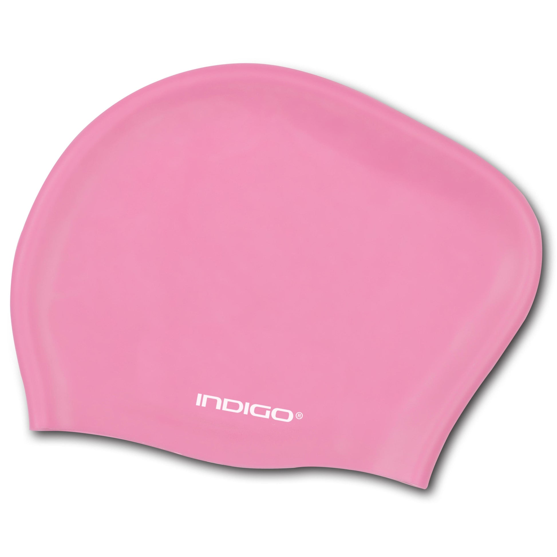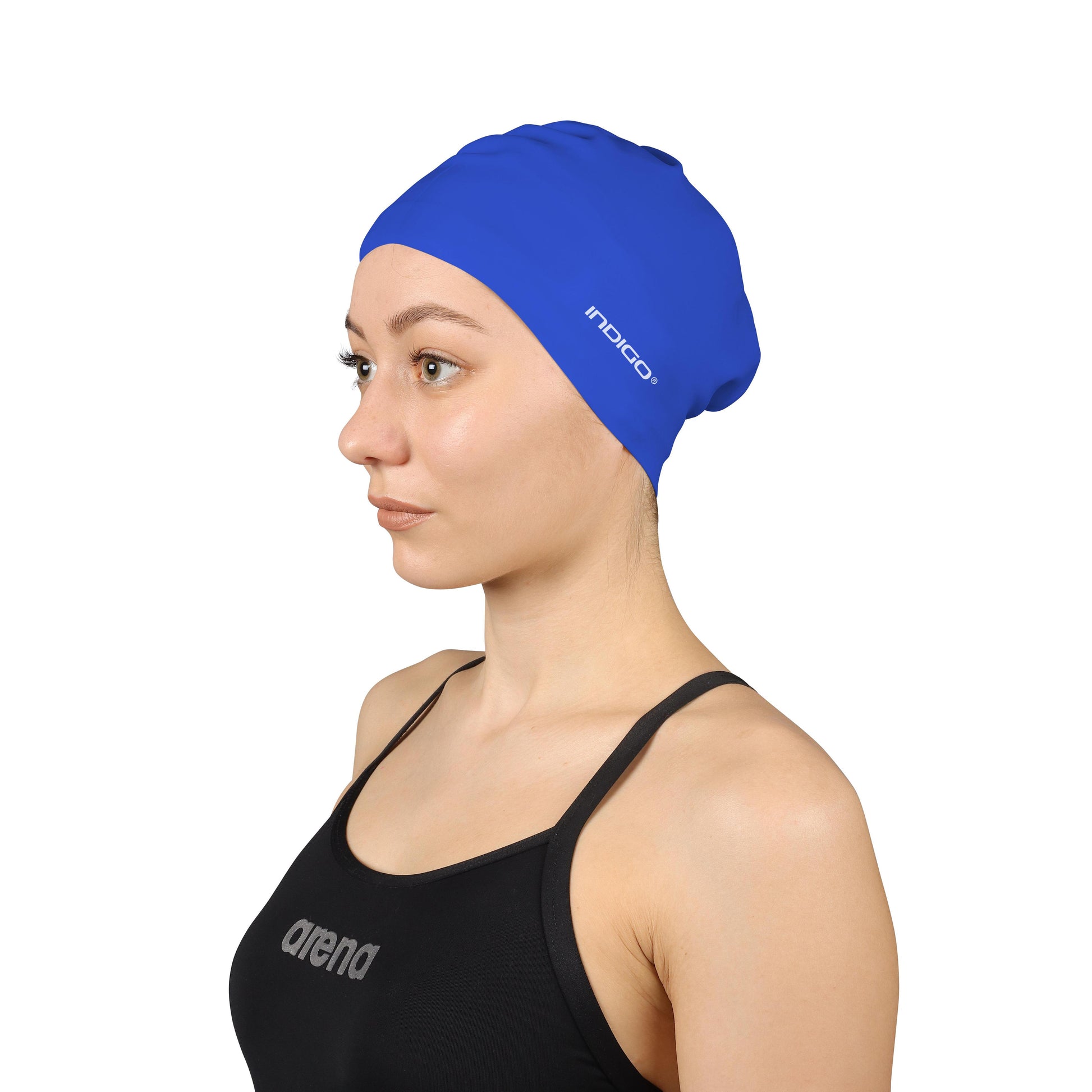 Touca de natação em silicone INDIGO para cabelos longos. Feito de silicone 100% de alta qualidade. Os chapéus são elásticos, elásticos e mais fáceis de colocar.